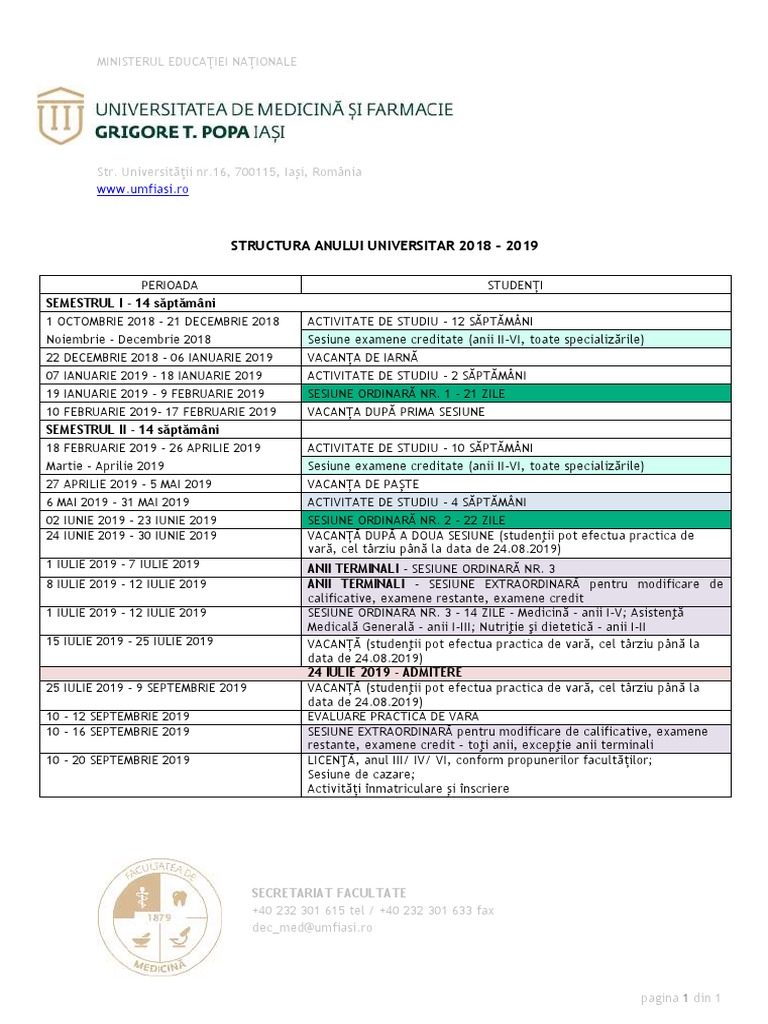 Structura An Universitar 2018. Perioada de desfăşurare a stagiului de practică poate fi cuprinsă atât în cursul anului universitar, cât şi în perioada vacanţelor universitare. Mai jos aveți fișiere în format pdf. Structura anului universitar 2017 2018 pentru învăţământul universitar de licen. Luni 02 octombrie vineri 22 decembrie. În anul școlar 2017/2018, structura anului universitar va fi același pentru învățământul superior la studii universitare de licență, master și studenții înscriși la studiile universitare de licență și master care vor trece de examene în anul i, ii, iii, iv și master vor termina cursurile pe 30 iunie 2018.