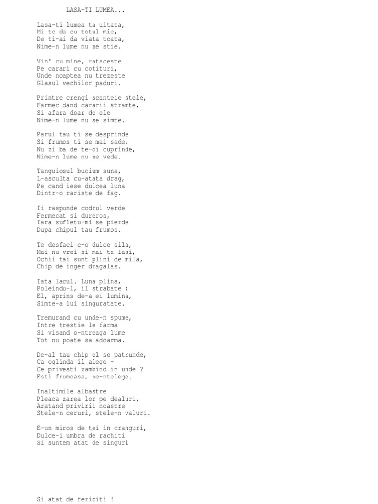 vizitati articolul complet aici : https://nonjustice.wordpress.com/tag/citat-despre-lume/ Lasa ti lumea gheorghe sarac versuri mihai eminescu. Vin, cu mine, rătăceşte pe cărări de cotituri unde noaptea se trezeste glasul vechilor păduri. In opinia mea, si opera literara lasati lumea de m.